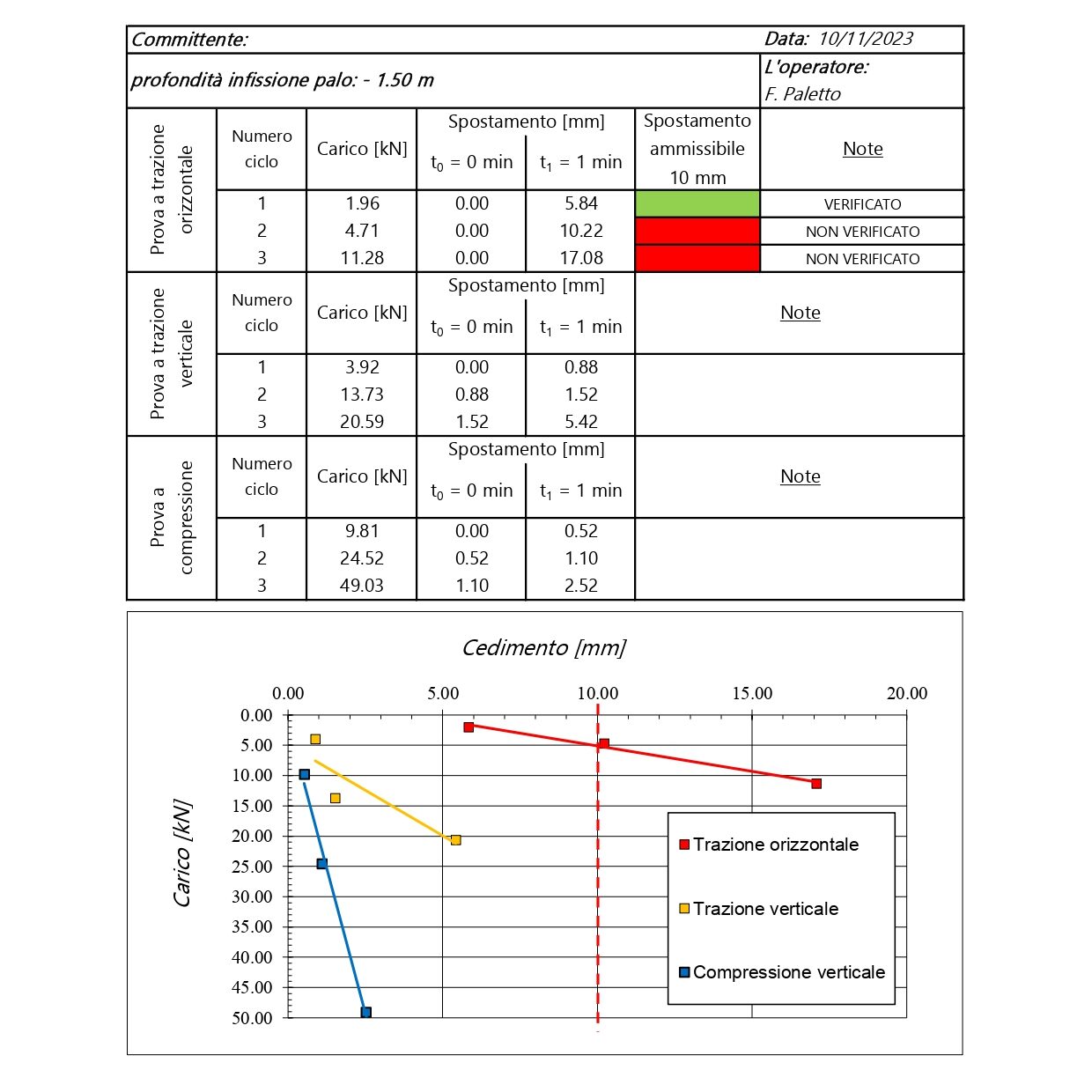 Eseguiti i test su ogni sostegno di prova viene redatta una relazione tecnica di commento che riporterà i risultati delle indagini con grafici e tabelle forza-spostamento. Tenuto conto dei risultati si valuterà una maggiore infissione dei pali oppure l’idoneità degli stessi.
